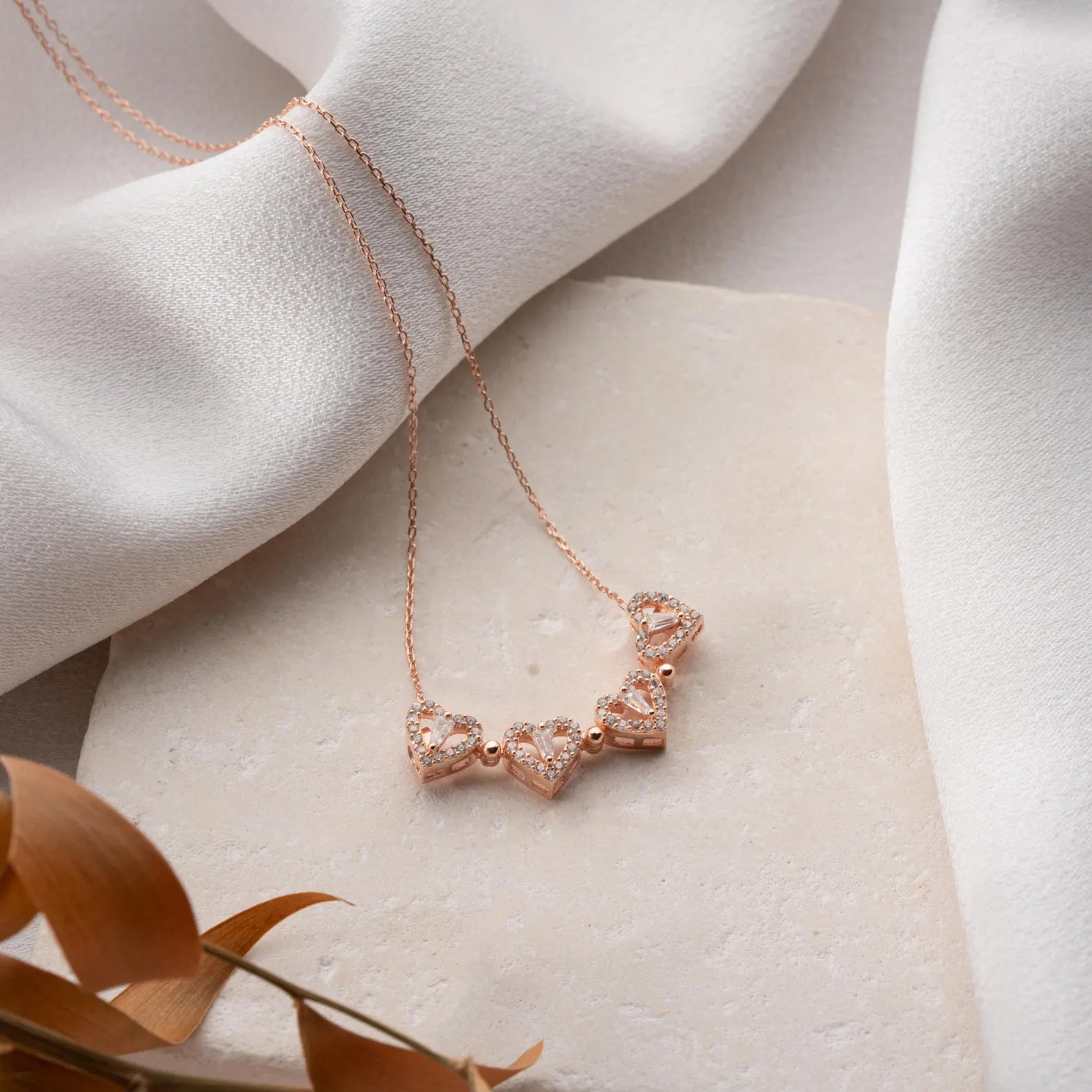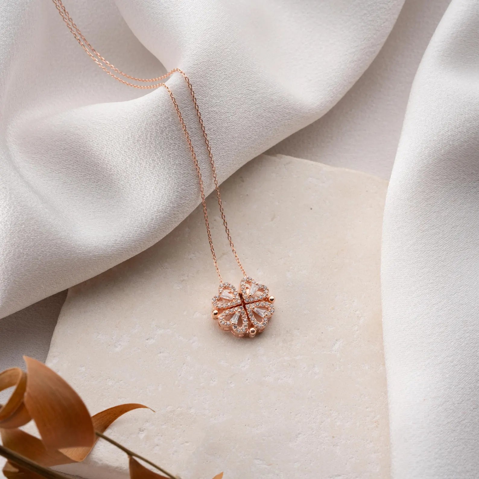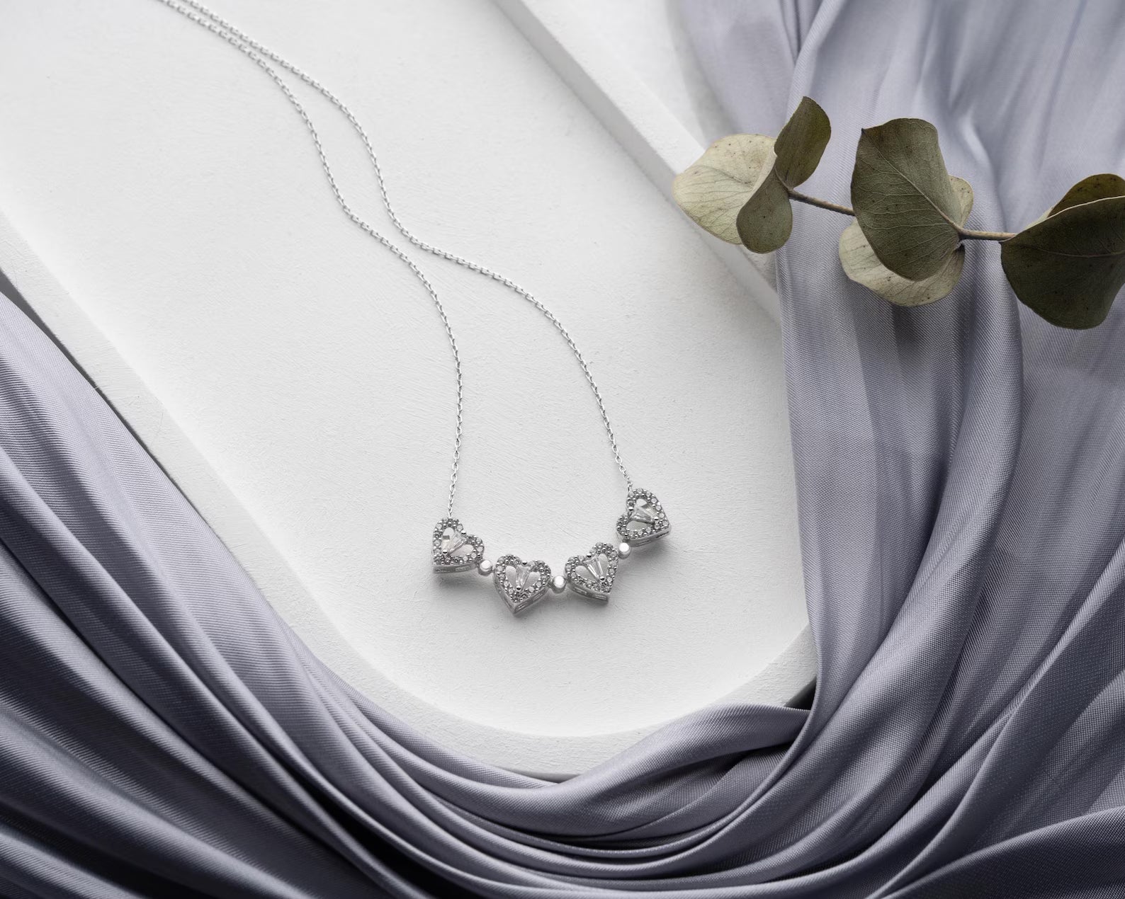 Its versatile 2-in-1 design offers two forms of expression – the four-leaf heart pendant for love & happiness or the row of hearts necklace for togetherness.